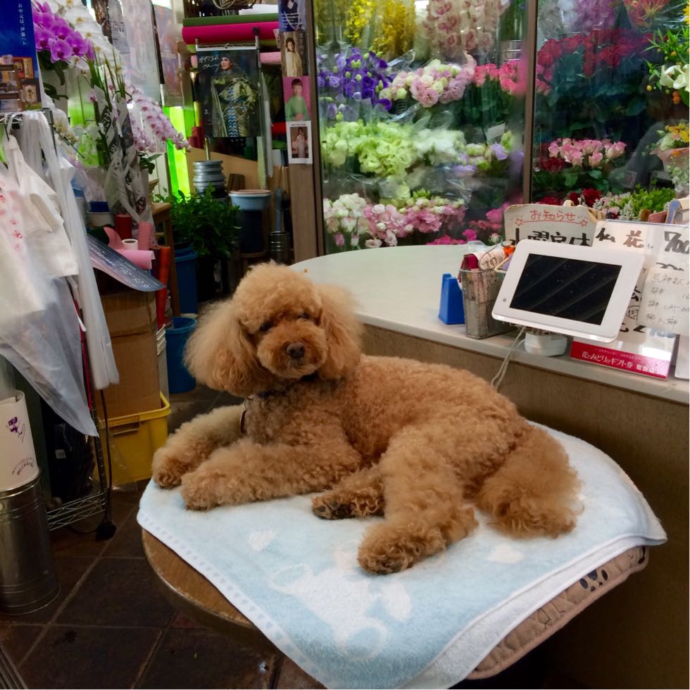 ホテルから劇団に行く間にあるお花屋さんの店先の看板犬。