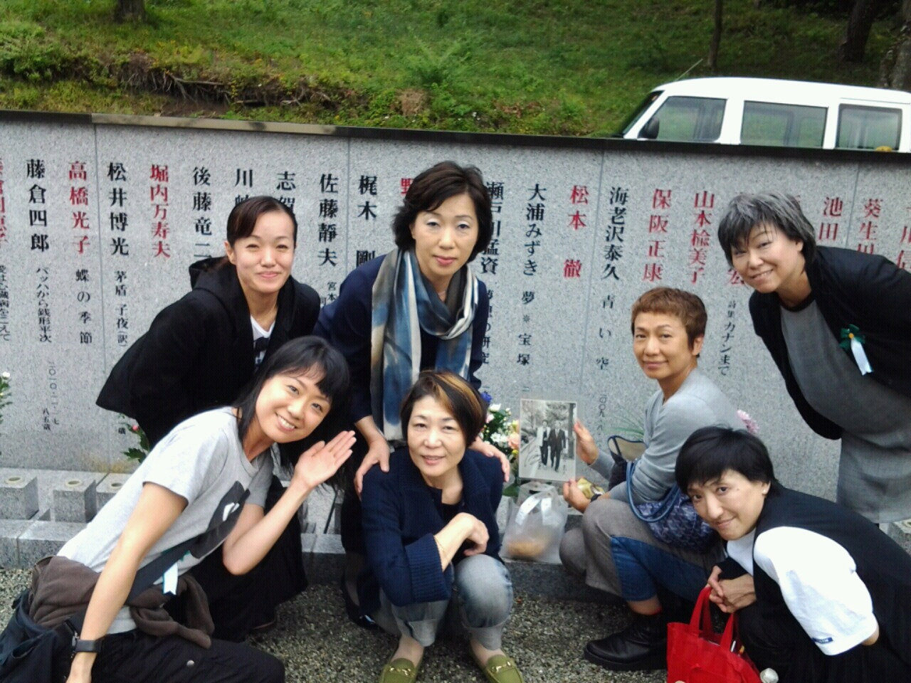 朝9時に千駄ヶ谷集合、バスに乗って富士霊園の文学者之墓に眠る大浦みずきさんこと我らがなーちゃんに会いに行ってきました。お姉さまをはじめ、雨宮さん、むっちゃん、美保さん、ゆっこさんと8名のちょっとした大人の遠足、今日は日本文藝家協会「文学者之墓」墓前祭にお誘いを受け参加させて頂いた次第です。なーちゃんのお父様は芥川賞作家の阪田寛夫さん、お父様の墓前、そしてお母様にも手を合わせて参りました。私となーちゃんはひとつ違いの凸凹コンビ、なかなか彼女の事は書けないでいます、今も。でも今後はエンビの神様の事をもっとお伝えしようと思います。しかし物凄い作家の方々の墓前に震える私でありました。バスの帰路中アップしております、千駄ヶ谷に着いたら速効ドラです!優しい気持ちでコンビを踊りましょうねー、身体バリバリ心ふわふわの清実でした。